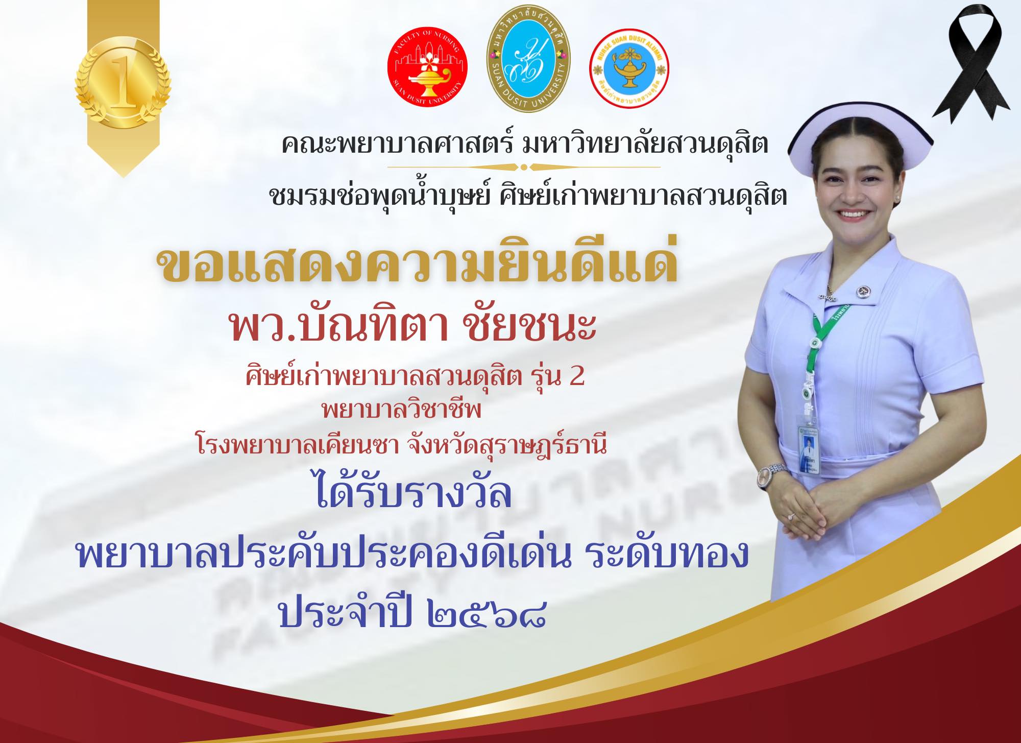 ขอแสดงความยินดีกับศิษย์เก่าพยาบาลสวนดุสิต พว.บัณทิตา ชัยชนะ ศิษย์เก่าพยาบาลสวนดุสิต รุ่นที่ ๒ และพยาบาลวิชาชีพโรงพยาบาลเคียนซา จังหวัดสุราษฎร์ธานี ได้รับรางวัลพยาบาลประคับประคอง ดีเด่น ระดับทอง