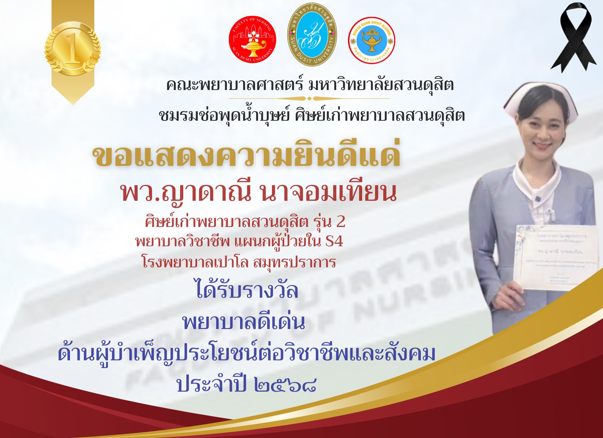 คณะพยาบาลศาสตร์ มหาวิทยาลัยสวนดุสิต และชมรมช่อพุดน้ำบุษย์ ศิษย์เก่าพยาบาลสวนดุสิต ขอแสดงความยินดี พว.ญาดาณี นาจอมเทียน ศิษย์เก่าพยาบาลสวนดุสิต รุ่นที่ ๒ และพยาบาลวิชาชีพโรงพยาบาลเปาโล สมุทรปราการ ได้รับรางวัลพยาบาลดีเด่น ด้านผู้บำเพ็ญประโยชน์ต่อวิชาชีพและสังคม