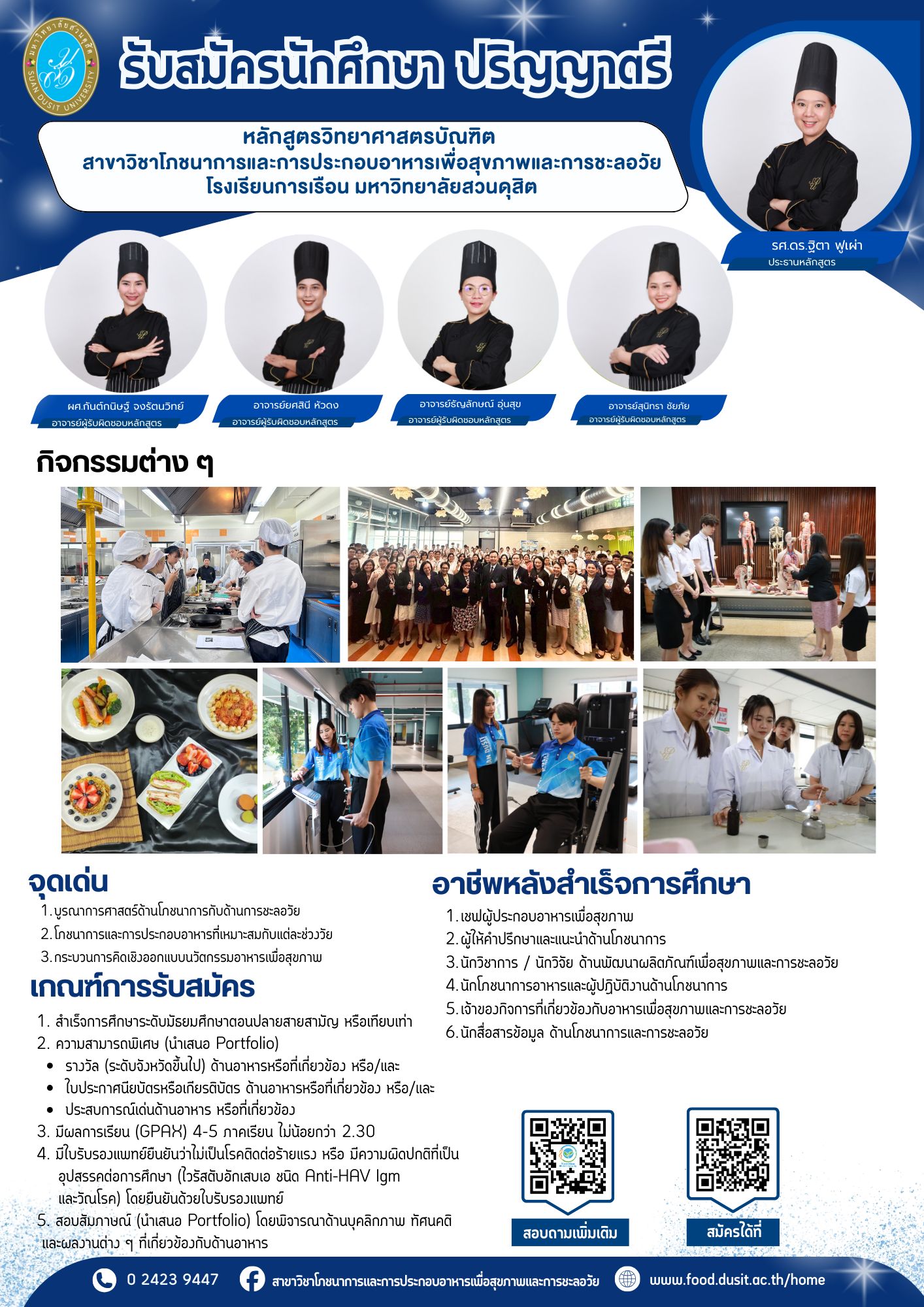 มุ่งผลิตบัณฑิตที่มีความรู้ด้านโภชนาการและทักษะการประกอบอาหารเพื่อสุขภาพ เสริมสมรรถนะในการวิเคราะห์ วางแผน และพัฒนาผลิตภัณฑ์อาหารตามหลักวิทยาศาสตร์