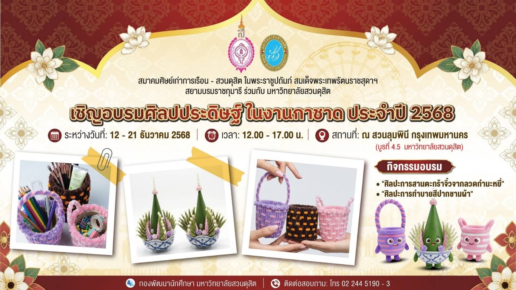 สมาคมศิษย์เก่าการเรือน – สวนดุสิต ในพระราชูปถัมภ์ สมเด็จพระเทพรัตนราชสุดาฯ สยามบรมราชกุมารี ร่วมกับ มหาวิทยาลัยสวนดุสิตขอเชิญชวนทุกท่านมาร่วมสนุกและฝึกทักษะกับกิจกรรม “อบรมศิลปประดิษฐ์ ในงานกาชาด ประจำปี 2568”