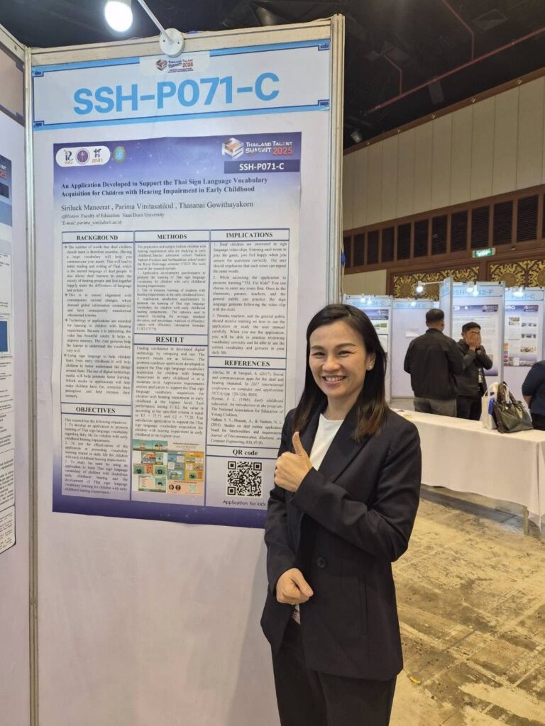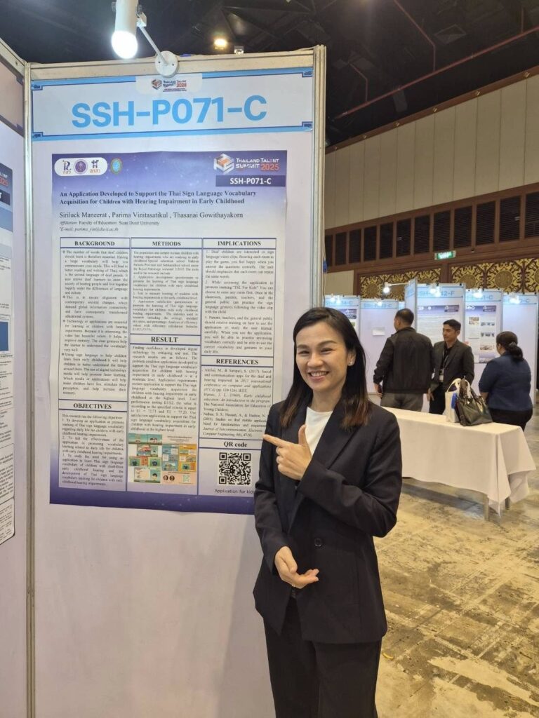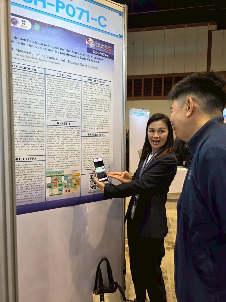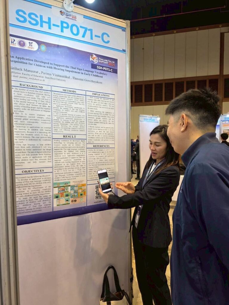 ในงานนี้ ศูนย์การศึกษาพิเศษ มหาวิทยาลัยสวนดุสิต ได้ร่วมนำเสนอผลงานทางวิชาการที่น่าสนใจ โดย ผศ.ดร.ภริมา วินิธาสถิตย์กุล (หัวหน้าศูนย์การศึกษาพิเศษ) ในหัวข้อ “An Application Developed to Support the Thai Sign Language Vocabulary Acquisition for Children with Hearing Impairment in Early Childhood”