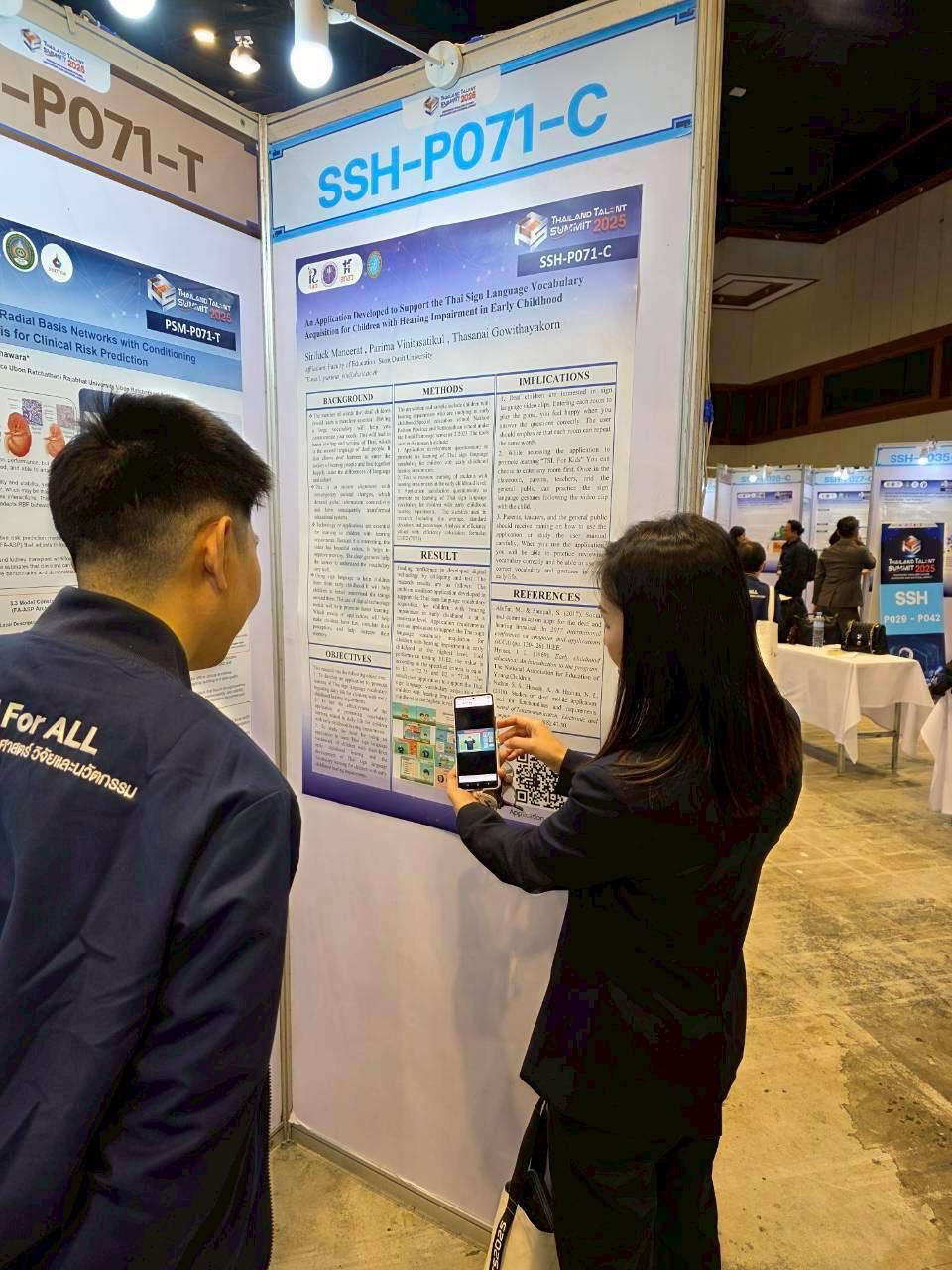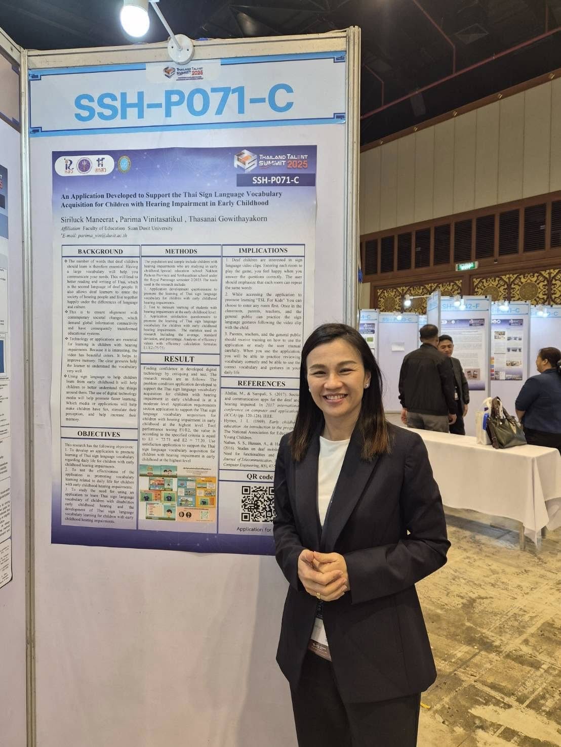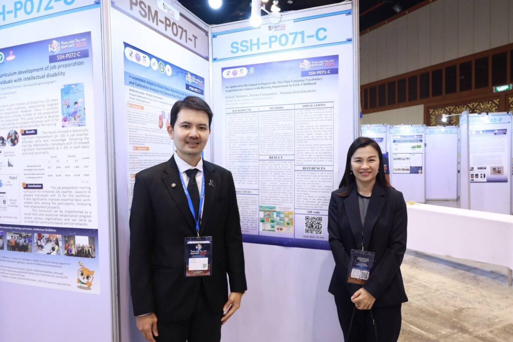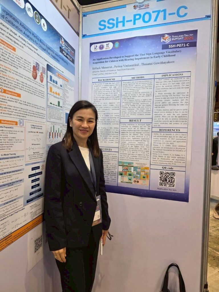 ในงานนี้ ศูนย์การศึกษาพิเศษ มหาวิทยาลัยสวนดุสิต ได้ร่วมนำเสนอผลงานทางวิชาการที่น่าสนใจ โดย ผศ.ดร.ภริมา วินิธาสถิตย์กุล (หัวหน้าศูนย์การศึกษาพิเศษ) ในหัวข้อ “An Application Developed to Support the Thai Sign Language Vocabulary Acquisition for Children with Hearing Impairment in Early Childhood”