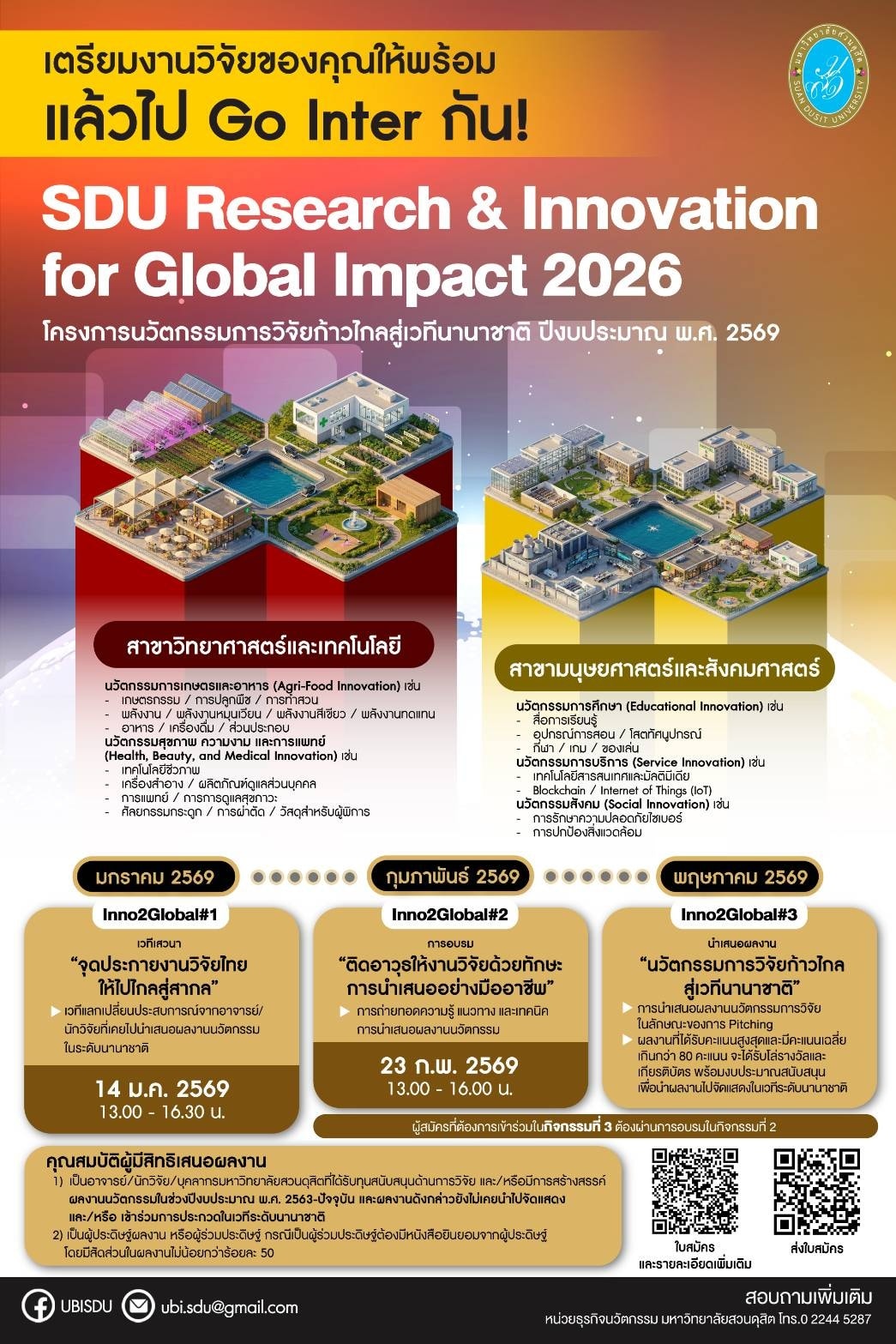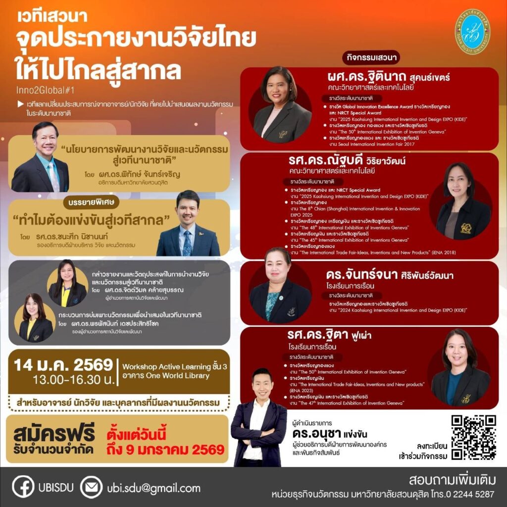 หน่วยธุรกิจนวัตกรรม สถาบันวิจัยและพัฒนา ขอเชิญอาจารย์ นักวิจัย และบุคลากรมหาวิทยาลัยสวนดุสิต เข้าร่วมโครงการ “SDU Research & Innovation for Global Impact 2026” โอกาสสำคัญในการผลักดันผลงานวิจัยและนวัตกรรมของคุณสู่การใช้ประโยชน์เชิงพาณิชย์ และสร้างชื่อเสียงในระดับนานาชาติ โดยพบกับกิจกรรมที่หลากหลาย