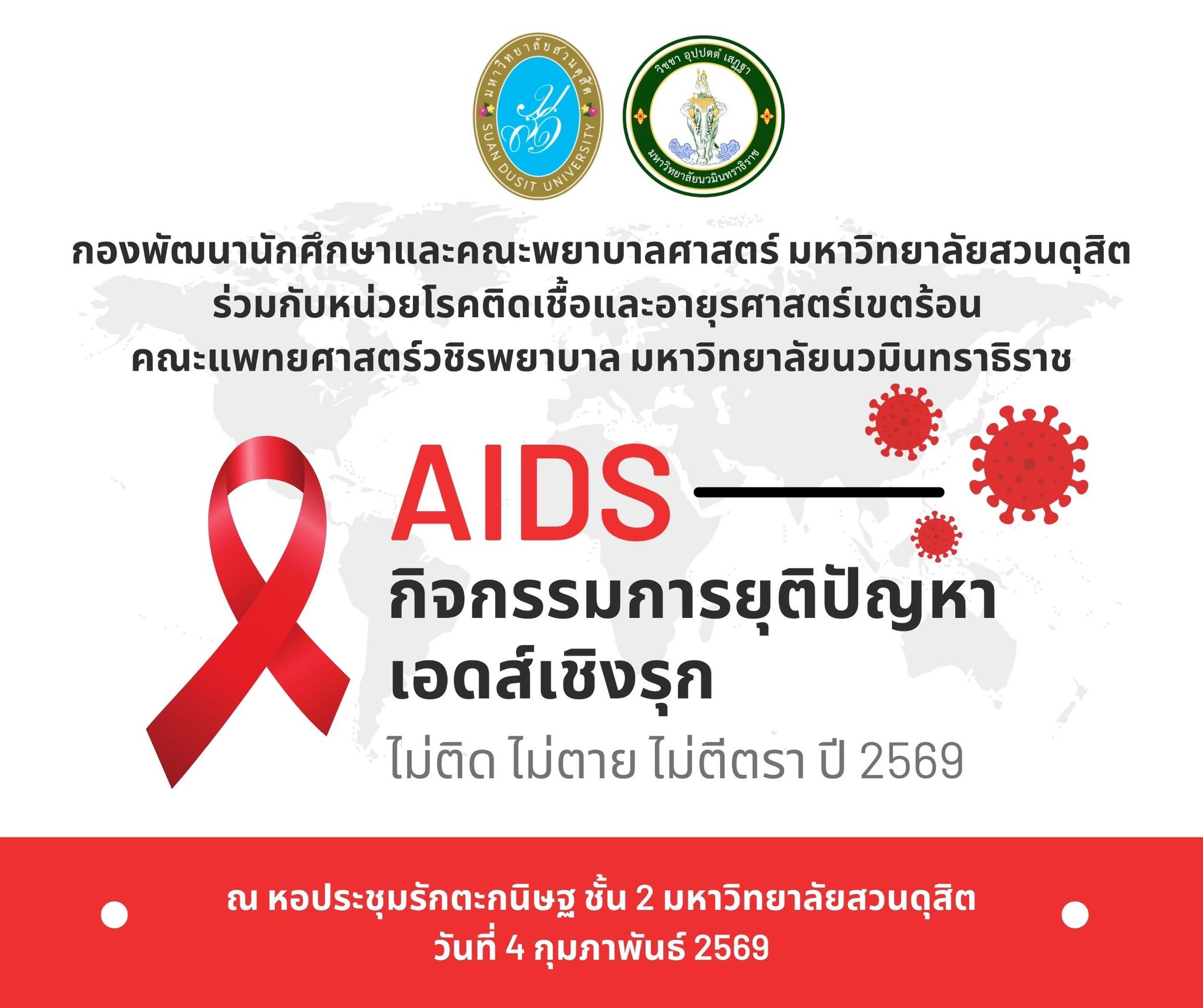 กองพัฒนานักศึกษา มหาวิทยาลัยสวนดุสิตและคณะพยาบาลศาสตร์ มหาวิทยาลัยสวนดุสิต ร่วมกับหน่วยโรคติดเชื้อและอายุรศาสตร์เขตร้อน คณะแพทยศาสตร์วชิรพยาบาล มหาวิทยาลัยนวมินทราธิราช จัดกิจกรรมยุติปัญหาเอดส์เชิงรุก ไม่ติด ไม่ตาย ไม่ตีตรา ปี ๒๕๖๙