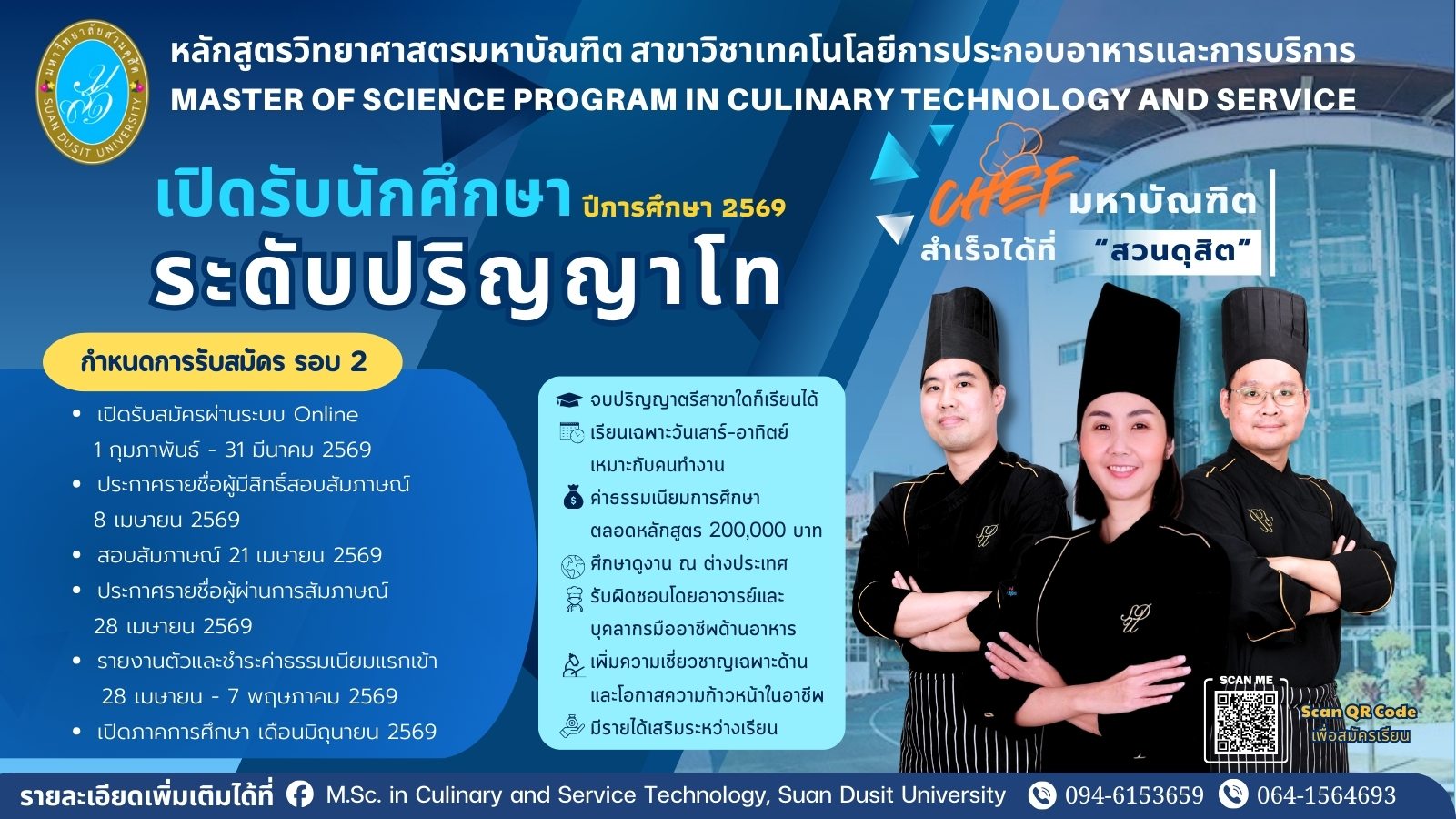 สอบถามเพิ่มเติมได้ที่ หลักสูตรวิทยาศาสตรมหาบัณฑิต สาขาวิชาเทคโนโลยีการประกอบอาหารและการบริการ