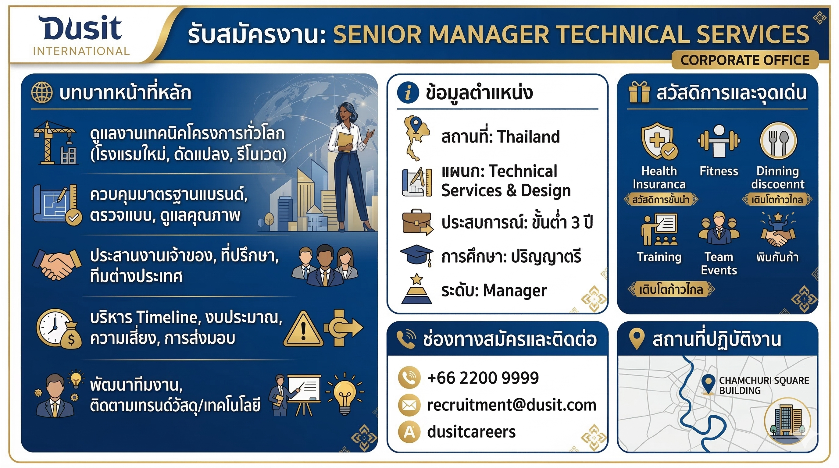 - 🌍 วางกลยุทธ์ ดูแล และควบคุมการดำเนินงานด้านเทคนิคแบบครบวงจรของโครงการโรงแรมใหม่ โครงการดัดแปลง และโครงการรีโนเวตขนาดใหญ่ของแบรนด์ดุสิตทั่วโลก