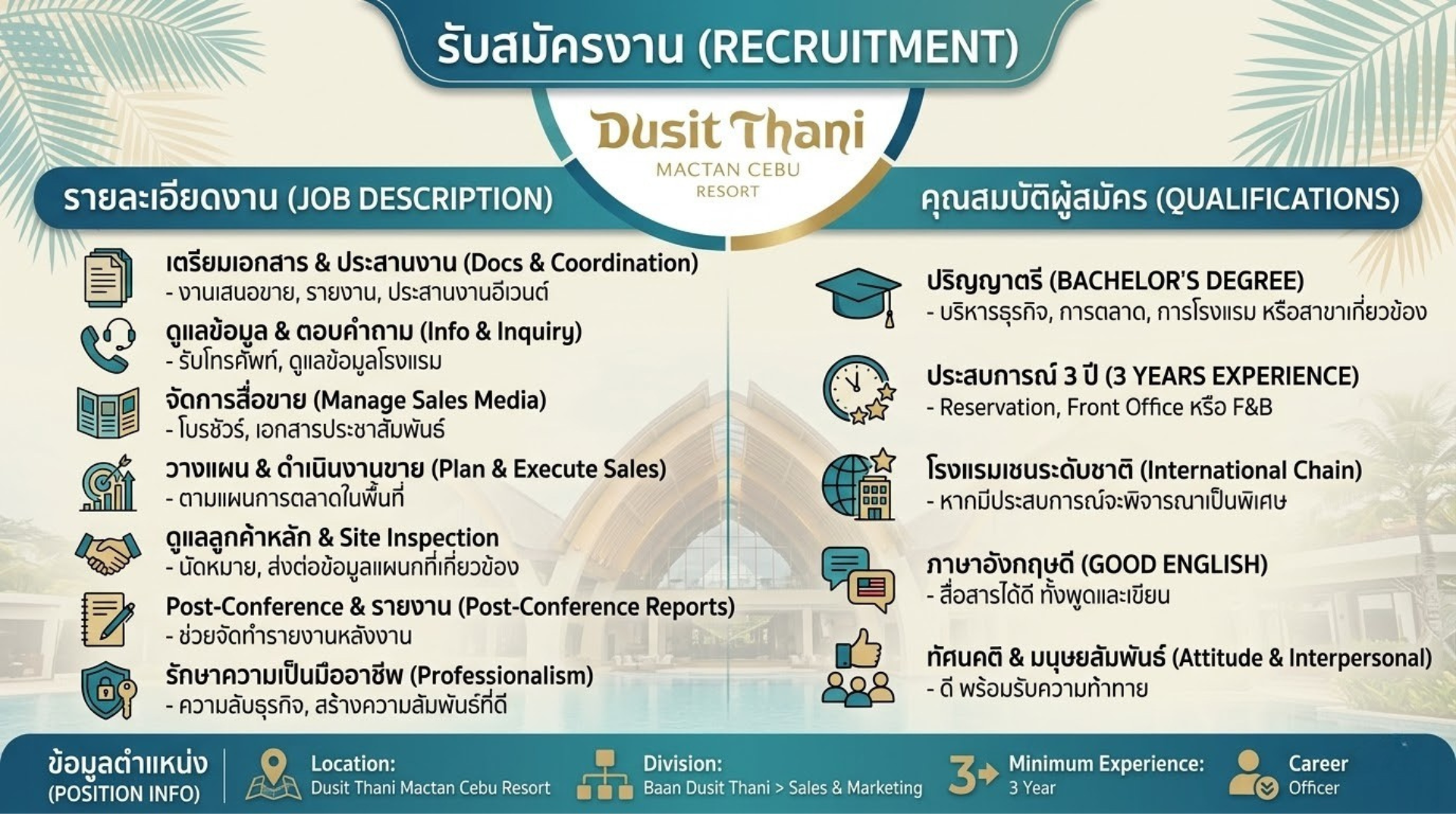 - มีประสบการณ์โรงแรมอย่างน้อย 3 ปี เช่น reservation, front office หรือ food & beverages