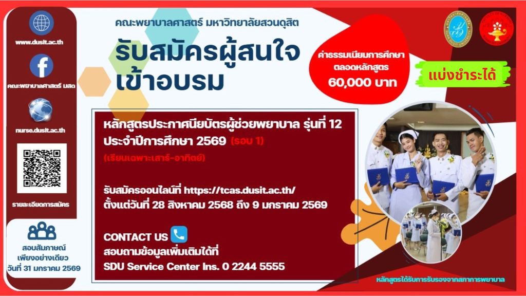 อ่านต่อ หลักสูตรประกาศนียบัตรผู้ช่วยพยาบาล รุ่นที่ 12 (อบรมเชิงวิชาชีพ ได้ประกาศนียบัตร รับรองโดยสภาการพยาบาล)