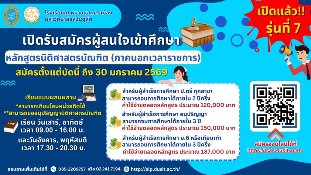เปิดรับสมัครนักศึกษาใหม่ ประจำปีการศึกษา 2569 สำหรับผู้สนใจเข้ารับการศึกษาหลักสูตรนิติศาสตรบัณฑิต (ภาคนอกเวลาราชการ) รุ่นที่ 7อ่านต่อ เปิดรับสมัครนักศึกษาใหม่ ประจำปีการศึกษา 2569 สำหรับผู้สนใจเข้ารับการศึกษาหลักสูตรนิติศาสตรบัณฑิต (ภาคนอกเวลาราชการ) รุ่นที่ 7