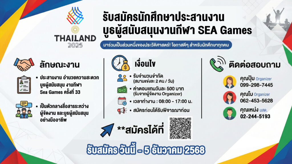 รับสมัครนักศึกษาประสานงานบูธผู้สนับสนุนงานกีฬา SEA Games ครั้งที่ 33อ่านต่อ รับสมัครนักศึกษาประสานงานบูธผู้สนับสนุนงานกีฬา SEA Games ครั้งที่ 33