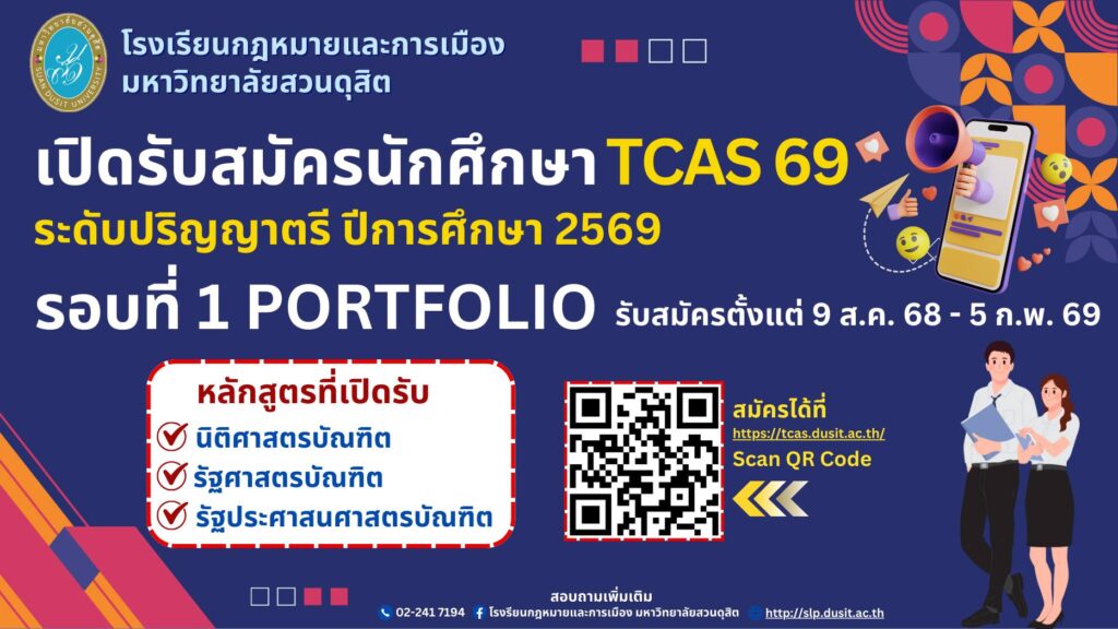 TCAS’69 เปิดรับสมัครนักศึกษาใหม่ ประจำปีการศึกษา 2569 รอบที่ 1 Portfolioอ่านต่อ TCAS’69 เปิดรับสมัครนักศึกษาใหม่ ประจำปีการศึกษา 2569 รอบที่ 1 Portfolio