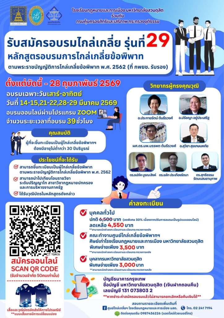 โรงเรียนกฎหมายและการเมือง มหาวิทยาลัยสวนดุสิต ร่วมกับ กรมคุ้มครองสิทธิและเสรีภาพ กระทรวงยุติธรรม รับสมัครอบรมไกล่เกลี่ย รุ่นที่ 29อ่านต่อ โรงเรียนกฎหมายและการเมือง มหาวิทยาลัยสวนดุสิต ร่วมกับ กรมคุ้มครองสิทธิและเสรีภาพ กระทรวงยุติธรรม รับสมัครอบรมไกล่เกลี่ย รุ่นที่ 29