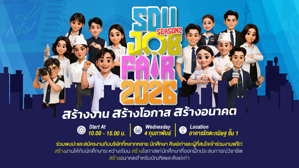 ขอเชิญ นักศึกษา ศิษย์เก่า และผู้ที่สนใจ เข้าร่วมงาน “SDU JOB FAIR 2026 Season 2” สร้างงาน สร้างโอกาส สร้างอนาคต ฟรี!!!อ่านต่อ ขอเชิญ นักศึกษา ศิษย์เก่า และผู้ที่สนใจ เข้าร่วมงาน “SDU JOB FAIR 2026 Season 2” สร้างงาน สร้างโอกาส สร้างอนาคต ฟรี!!!