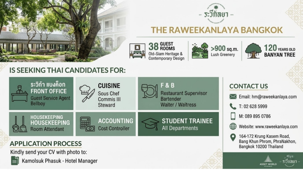 รับสมัครหลายตำแหน่ง : The Raweekanlaya Bangkok Wellness Cuisine ResortPosted on March 12, 2026อ่านต่อ รับสมัครหลายตำแหน่ง : The Raweekanlaya Bangkok Wellness Cuisine Resort