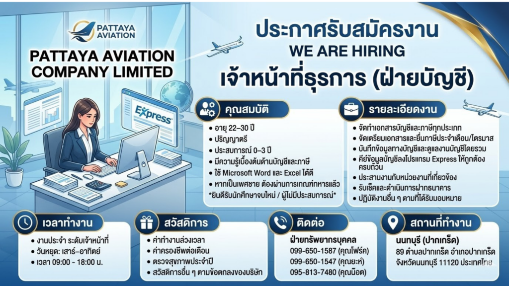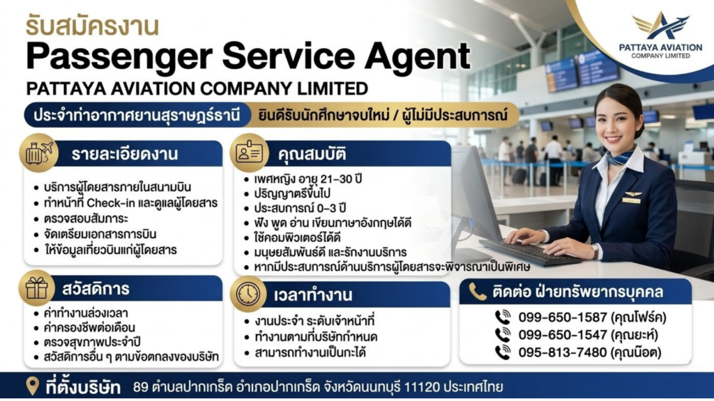 รับสมัคร: พนักงานประชาสัมพันธ์Posted on March 18, 2026อ่านต่อ รับสมัคร: พนักงานประชาสัมพันธ์รับสมัคร: เจ้าหน้าที่ธุรการ (ฝ่ายบัญชี)Posted on March 12, 2026อ่านต่อ รับสมัคร: เจ้าหน้าที่ธุรการ (ฝ่ายบัญชี)รับสมัคร: Passenger Service AgentPosted on March 12, 2026อ่านต่อ รับสมัคร: Passenger Service Agentรับสมัครหลายตำแหน่ง : The Raweekanlaya Bangkok Wellness Cuisine ResortPosted on March 12, 2026อ่านต่อ รับสมัครหลายตำแหน่ง : The Raweekanlaya Bangkok Wellness Cuisine Resortรับสมัคร: Event ExecutivePosted on March 11, 2026อ่านต่อ รับสมัคร: Event Executiveรับสมัคร: Senior Manager Technical ServicesPosted on March 11, 2026อ่านต่อ รับสมัคร: Senior Manager Technical Servicesรับสมัคร: แผนกคอมพิวเตอร์Posted on March 11, 2026อ่านต่อ รับสมัคร: แผนกคอมพิวเตอร์รับสมัคร: Talent Acquisition (สรรหาพนักงาน)Posted on March 11, 2026อ่านต่อ รับสมัคร: Talent Acquisition (สรรหาพนักงาน)รับสมัคร: Content Creator Tiktok (ทำงานเสาร์เว้นเสาร์)Posted on March 11, 2026อ่านต่อ รับสมัคร: Content Creator Tiktok (ทำงานเสาร์เว้นเสาร์) Posts pagination 1 2 3 Next Page