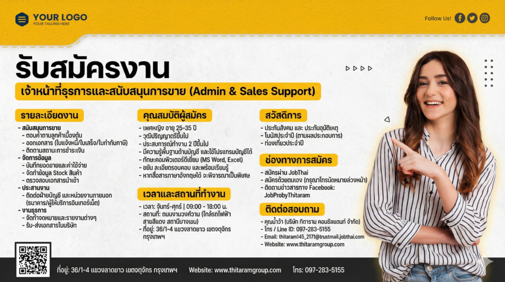 ประกาศรับสมัครงาน: เจ้าหน้าที่สนับสนุนการขายและธุรการPosted on February 15, 2026อ่านต่อ ประกาศรับสมัครงาน: เจ้าหน้าที่สนับสนุนการขายและธุรการ