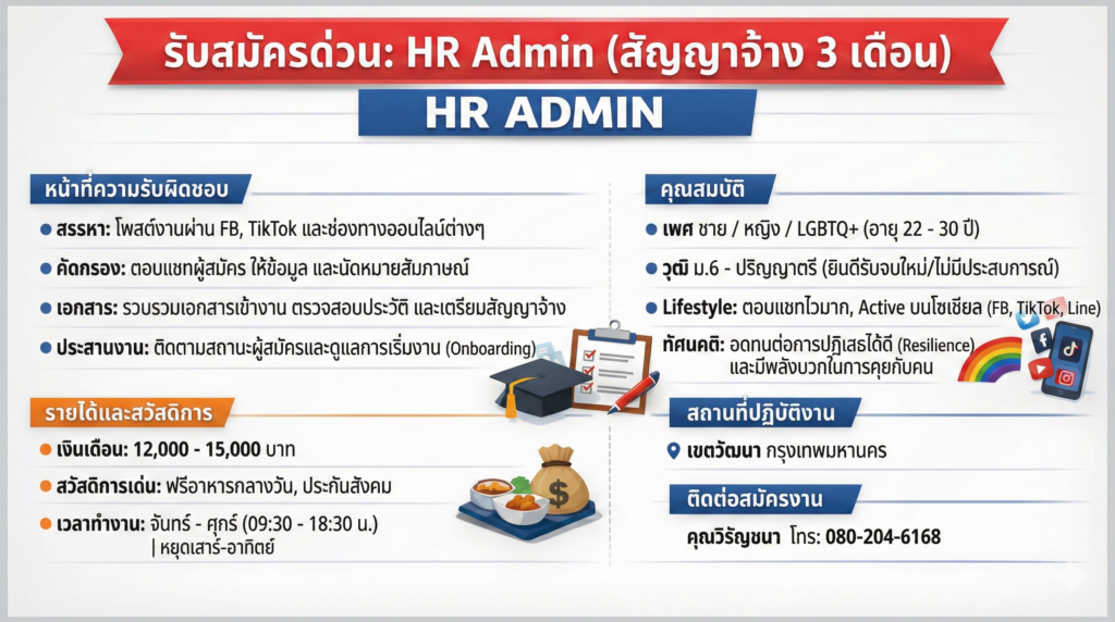รับสมัครด่วน: HR Admin (Contract 3 Months)Posted on February 15, 2026อ่านต่อ รับสมัครด่วน: HR Admin (Contract 3 Months)