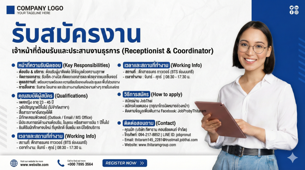 รับสมัคร: พนักงานประชาสัมพันธ์ (Receptionist)Posted on February 15, 2026อ่านต่อ รับสมัคร: พนักงานประชาสัมพันธ์ (Receptionist)